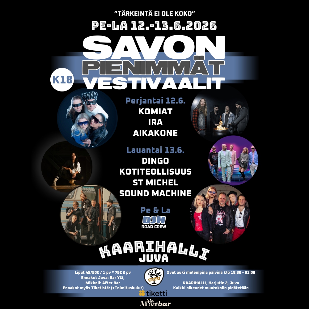 | Osta liput täältä | https://www.tiketti.fi/savon-pienimmat-vestivaalit-juvan-kaarihalli-juva-lippuja/113645 |