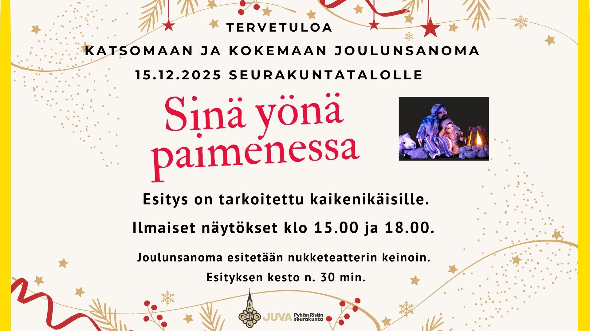 | Tapahtuman www-osoite | https://www.juvanseurakunta.fi/tapahtumat/2025-12-15/sina-yona-paimenessa |