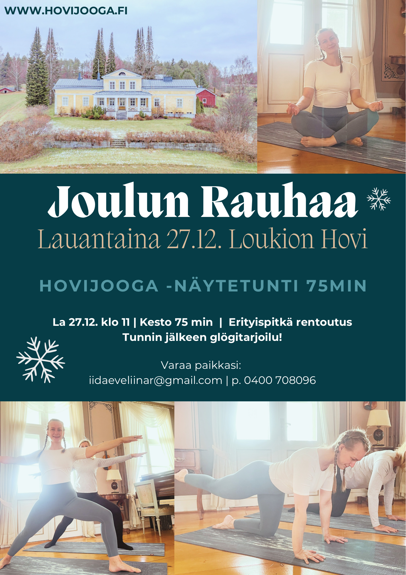 Tervetuloa rauhoittumaan Joulun erityisnäytetunnille Loukion Hoviin lauantaina 27.12. klo 11! Tunnin jälkeen glögitarjoilu.