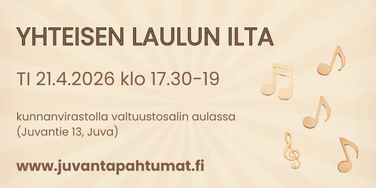 Yhteisen laulun ilta - yhteislaulutilaisuus ti 21.4.2026 klo 17.30-19 Juvan kunnanviraston valtuustosalin aulassa. Säestys: Hartsihemmo ja Pirunkeuhko.