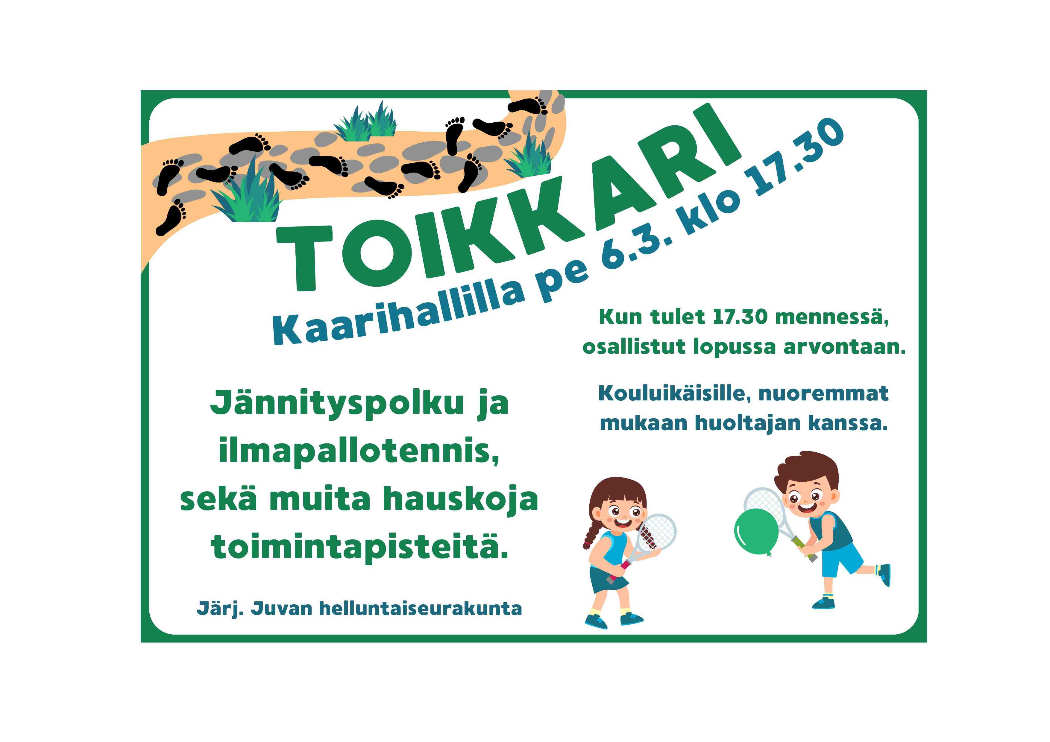 Tapahtumailta, jonka aikana on mahdollisuus tutustua moniin mielenkiintoisiin toimintapisteisiin, tällä kertaa mm. jännityspolku ja ilmapallotennis. Lisäksi opetustuokio ja iltapala. Maksuton ilta on tarkoitettu kouluikäisille, mutta sitäkin nuoremmat voivat osallistua siihen huoltajan kanssa.