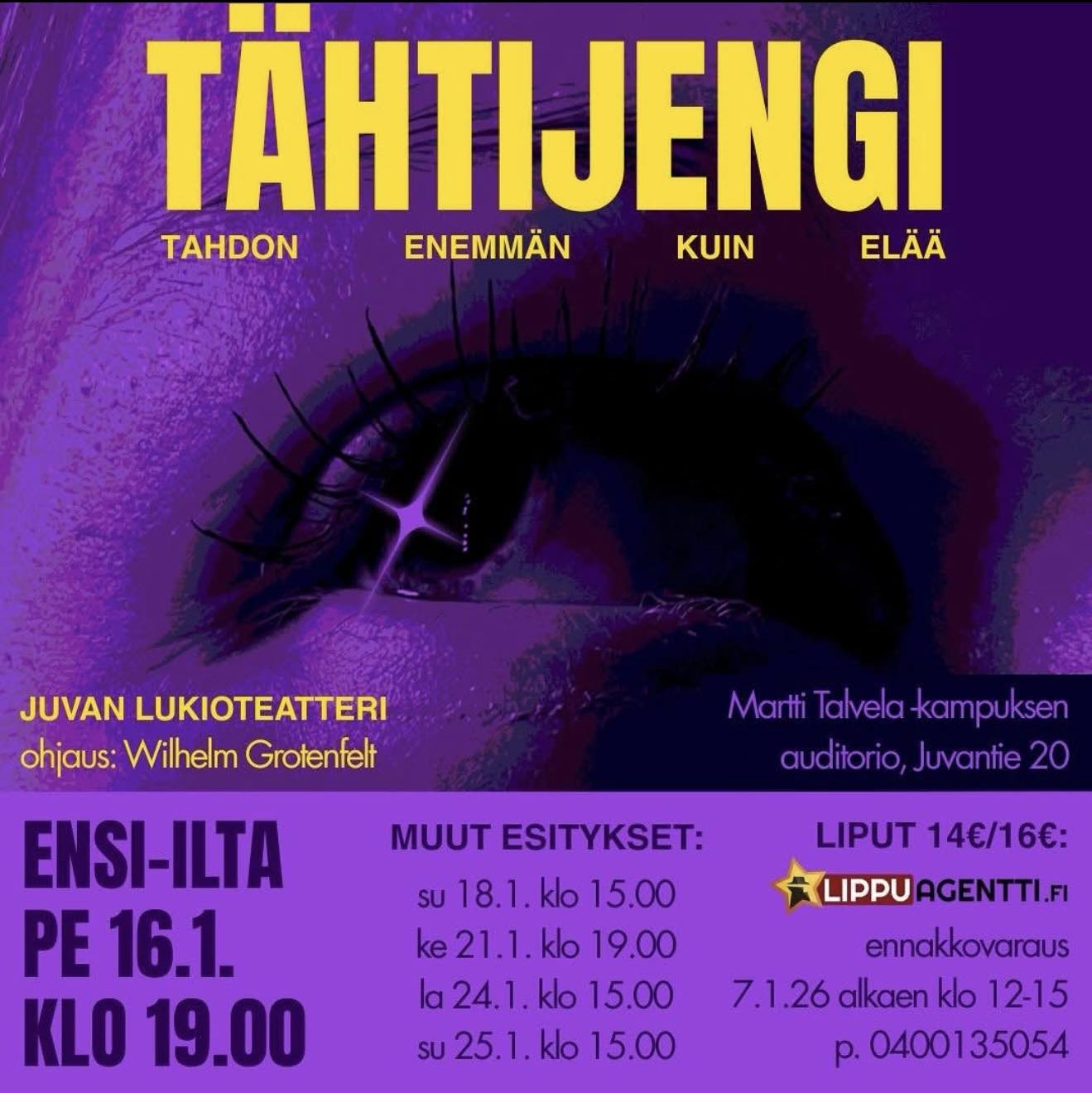 Tähtijengi juhlistaa hetkessä elämisen taitoa ja yhteisön voimaa.Näytelmä perustuu Juvan lukion opiskelijoiden teksteihin heidän tulevaisuuden unelmista, peloista ja haaveista.