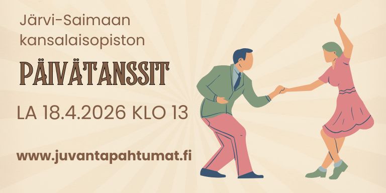Järvi-Saimaan kansalaisopiston Päivätanssit la 18.4.2026 klo 13-15 entisen ammattiopiston liikuntasalissa (Tirrolantie 7, Juva)